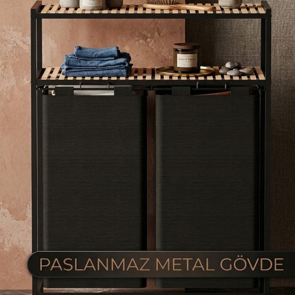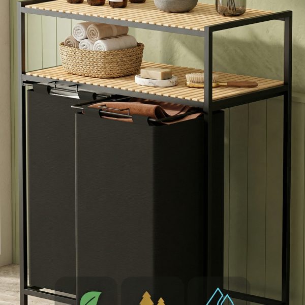 Kirli Sepeti Ahşap Raflı 2 Katlı 2 Bölmeli Kumaş Banyo Dolabı Düzenleyici Çamaşır sepeti