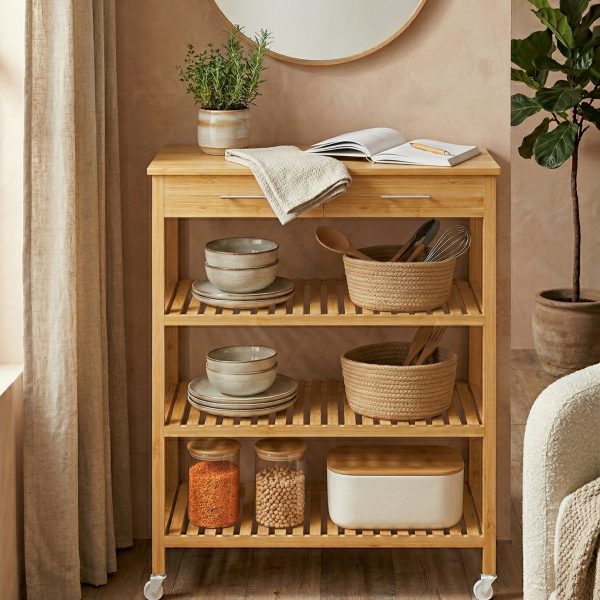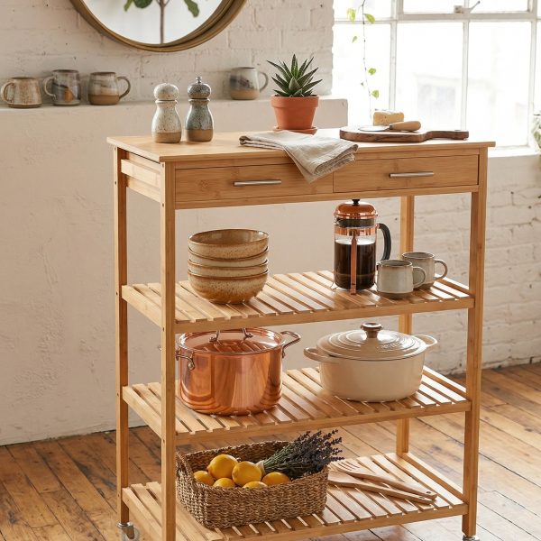 Bambu 2 Çekmeceli 3 Raflı Tekerlekli Bango Düzenleyici Dolap Servis Arabası