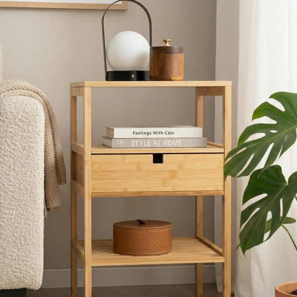 Doğal Bambu Tek Çekmeceli Raflı Komodin Yan Sehpa
