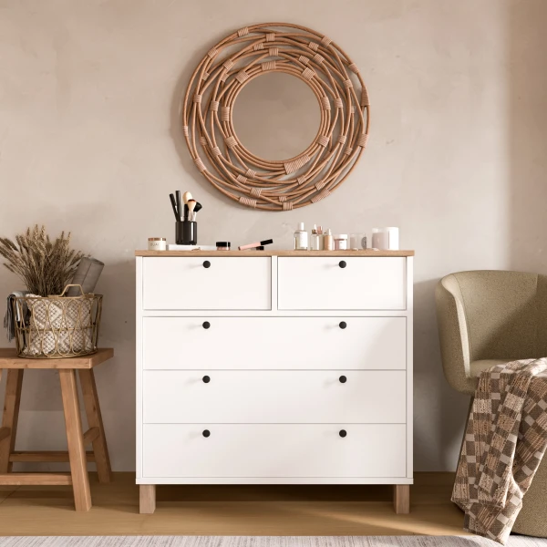 Robin Home Alaska Şifonyer 5 Çekmece Ahşap Ayaklı Sepet-Beyaz