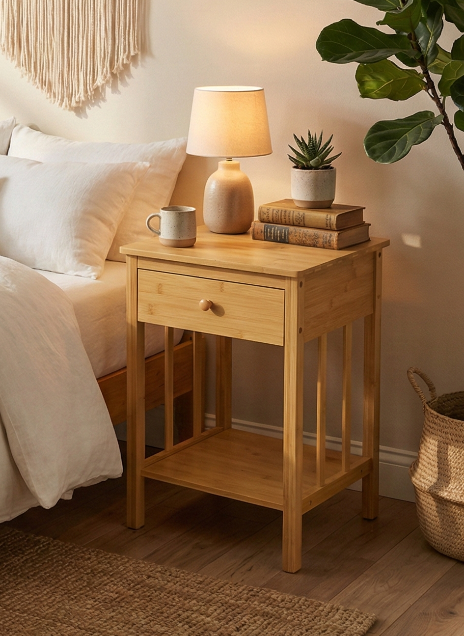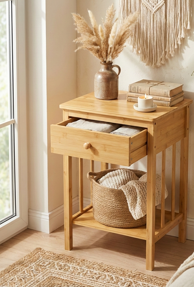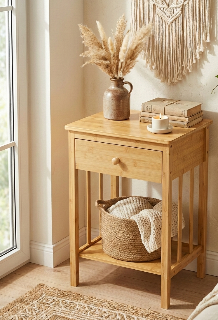 Doğal Bambu Tek Çekmeceli Raflı Komodin Yan Sehpa