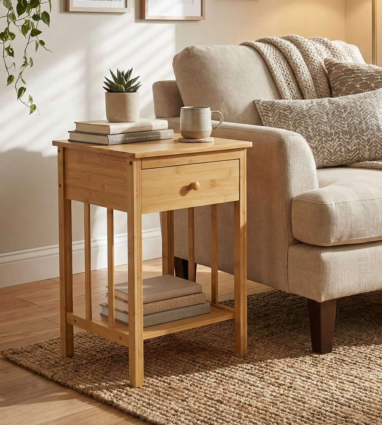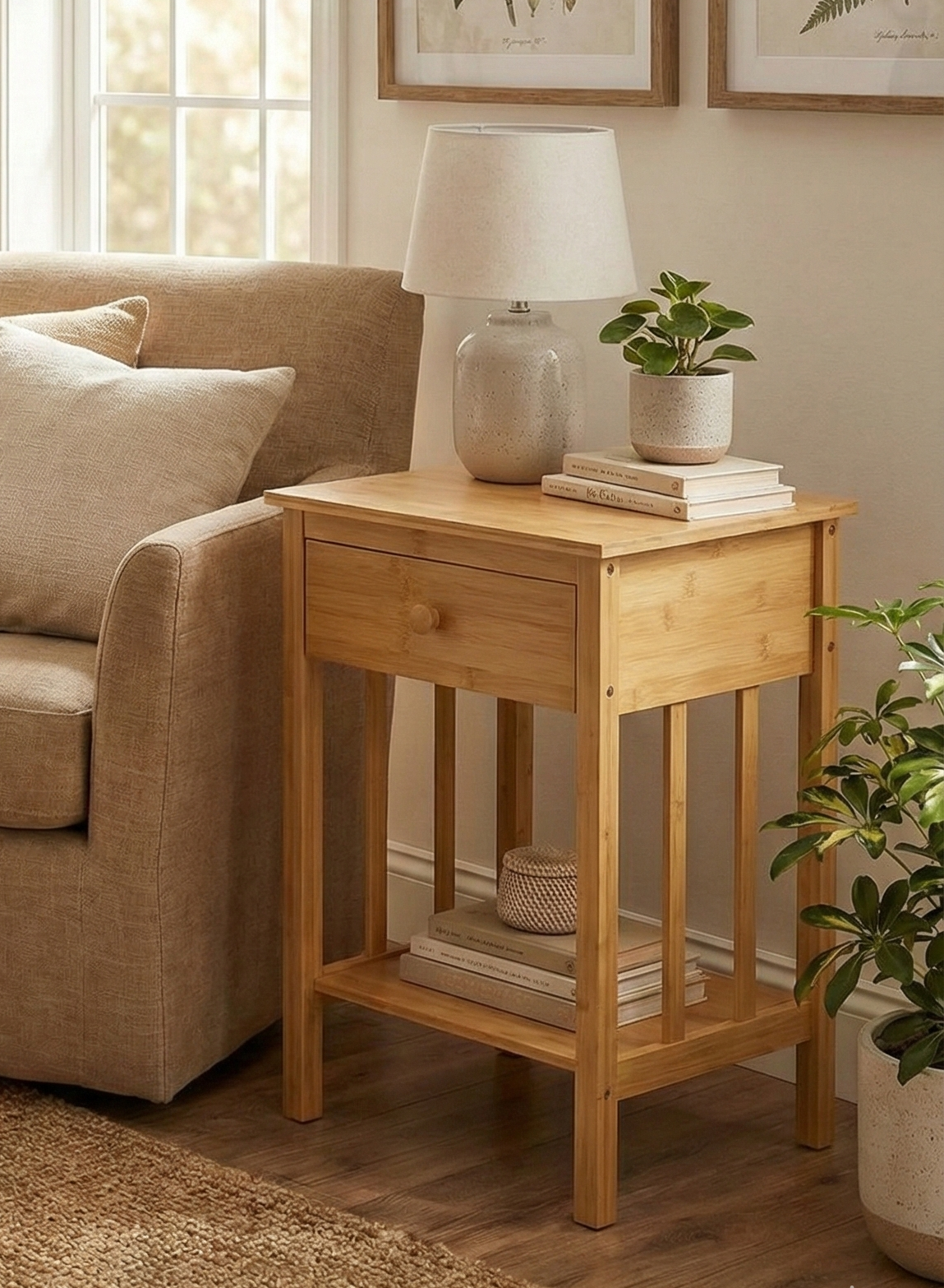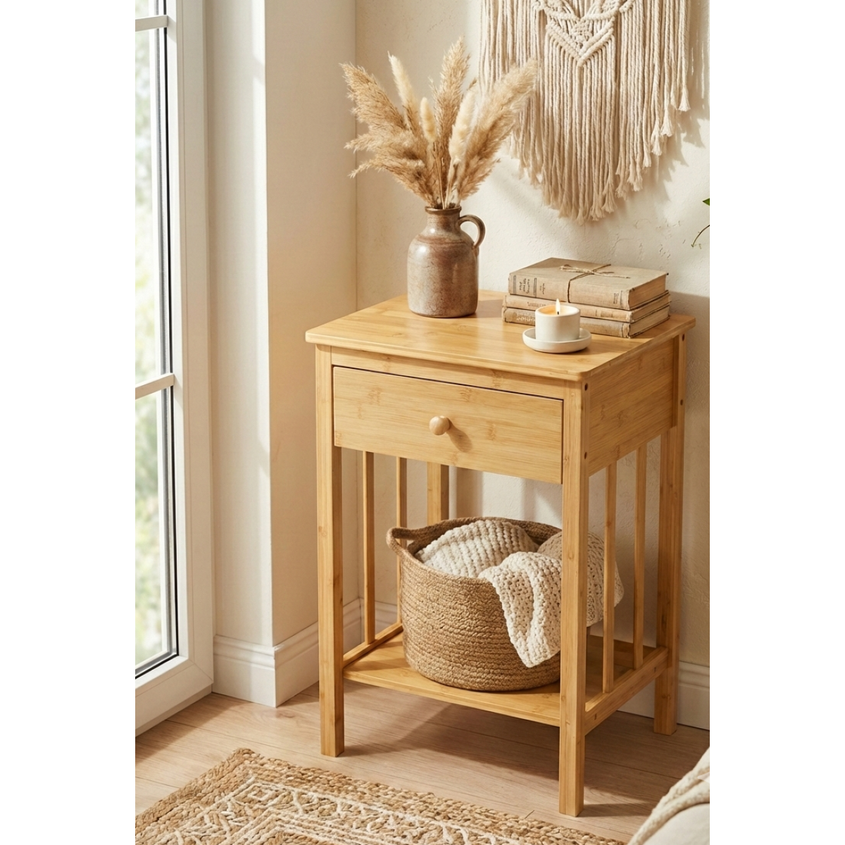 Doğal Bambu Tek Çekmeceli Raflı Komodin Yan Sehpa