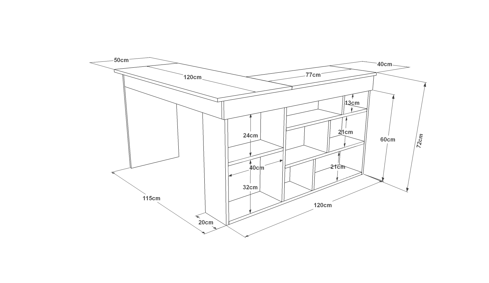 Çalışma alanı uzun parçanın derinliği 50cm,sağdaki kitaplıklı bölümün derinliği 40cm’dir. Ürünün yüksekliği 72’cmdir.