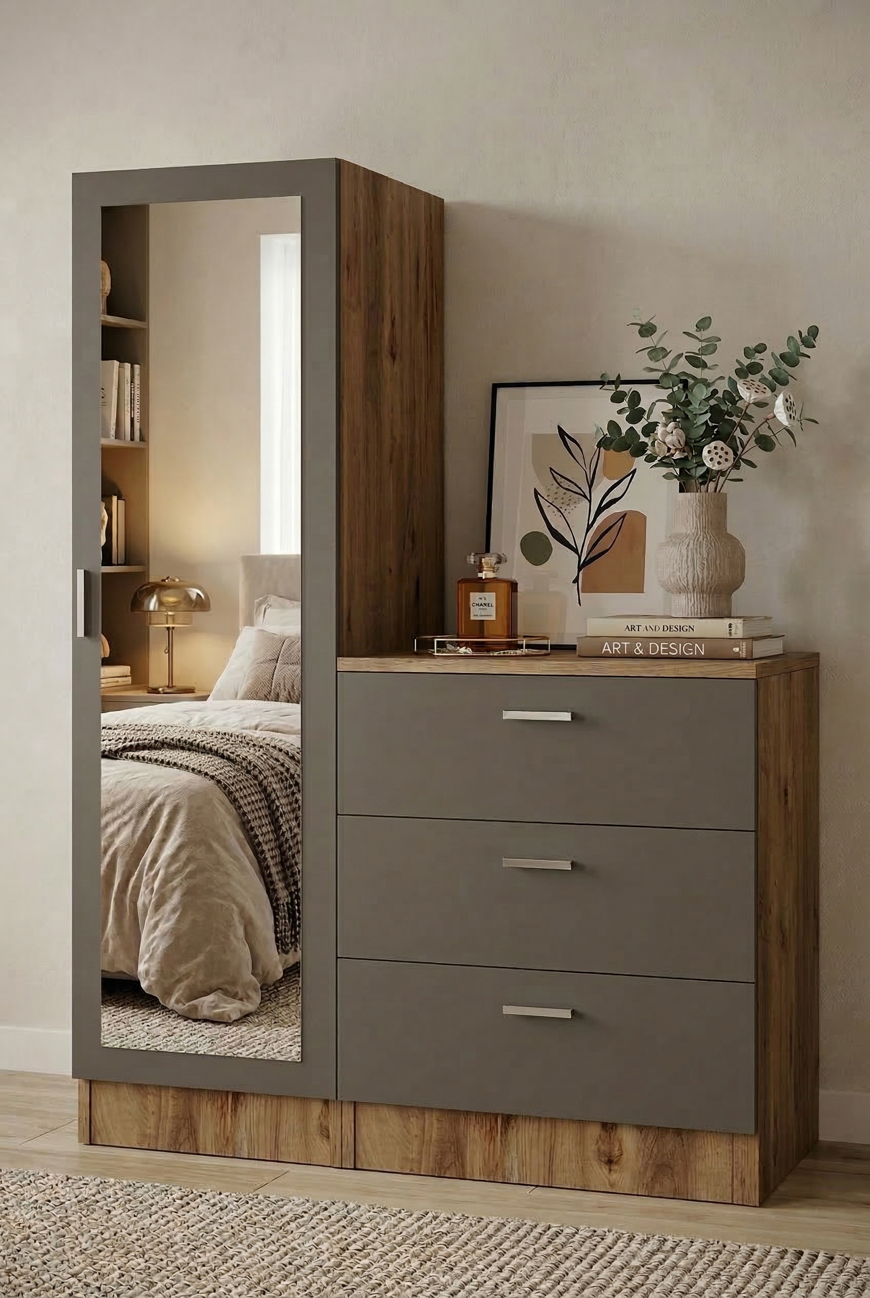 Robin Home Lyana Aynalı Şifonyer Gardırop Çam-Gri